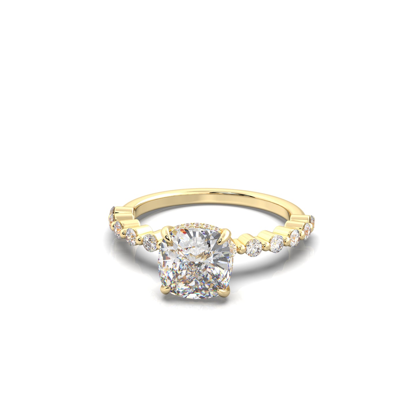 The Aleena is designed to turn heads. With round-cut diamonds lining the band in a shared prong setting, it delivers nonstop sparkle. A hidden halo adds extra shine beneath the center stone, making it stand out even more. Elevated and eye-catching, the center diamond takes center stage. This ring is all about timeless beauty and bold brilliance.