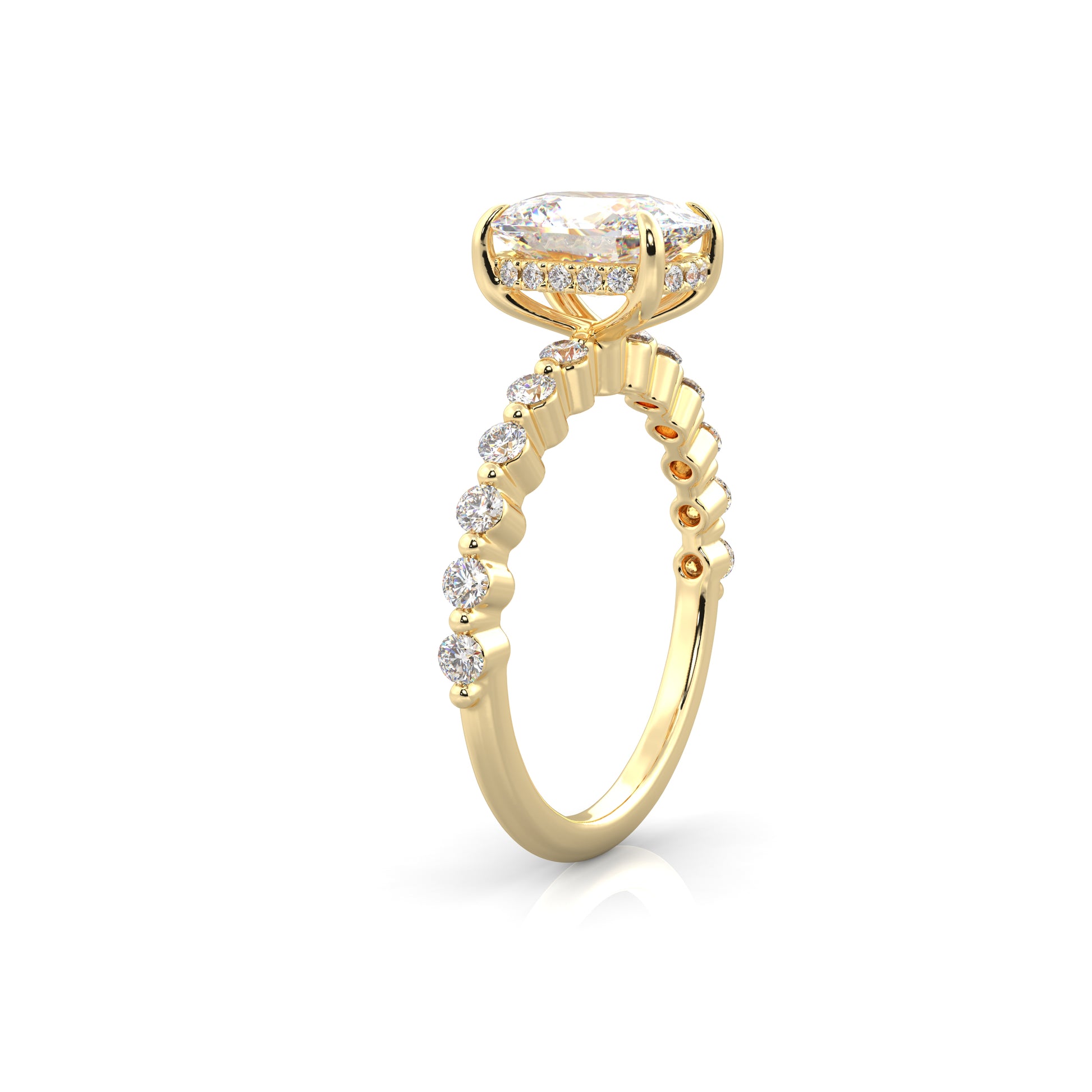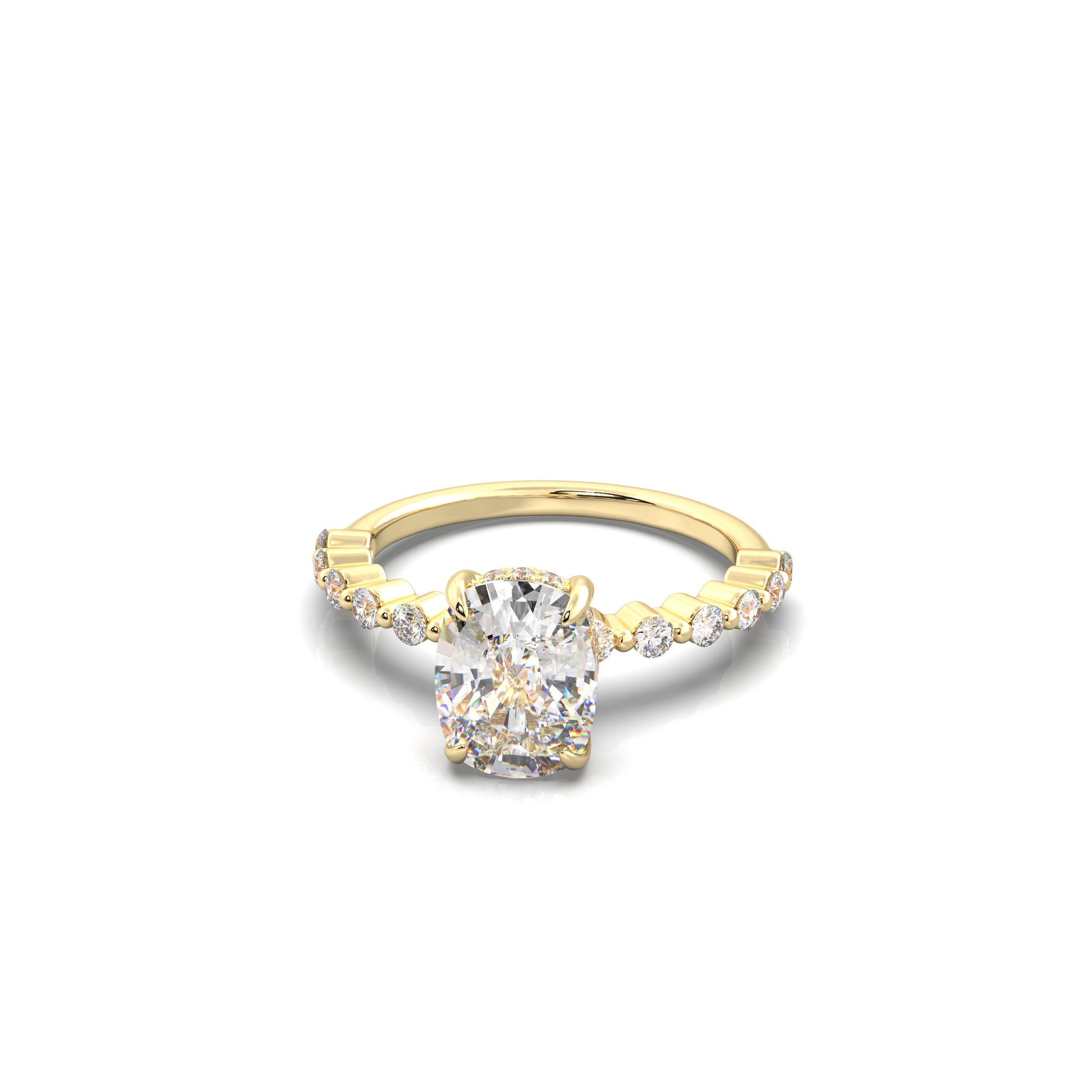 The Aleena is designed to turn heads. With round-cut diamonds lining the band in a shared prong setting, it delivers nonstop sparkle. A hidden halo adds extra shine beneath the center stone, making it stand out even more. Elevated and eye-catching, the center diamond takes center stage. This ring is all about timeless beauty and bold brilliance.