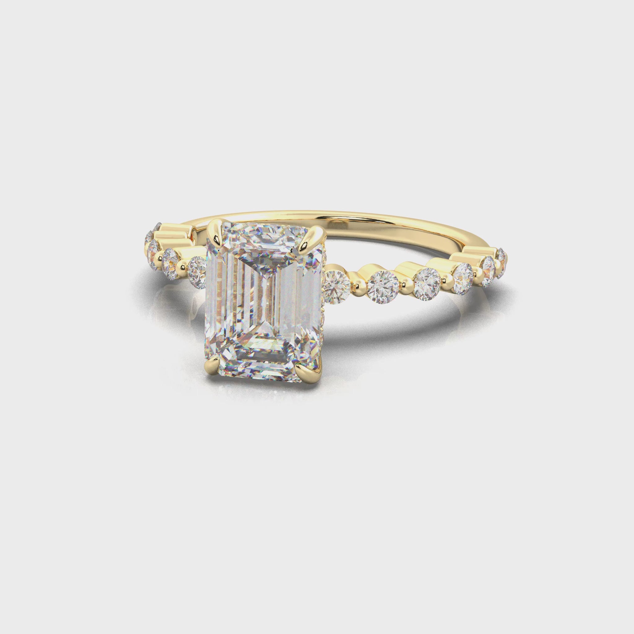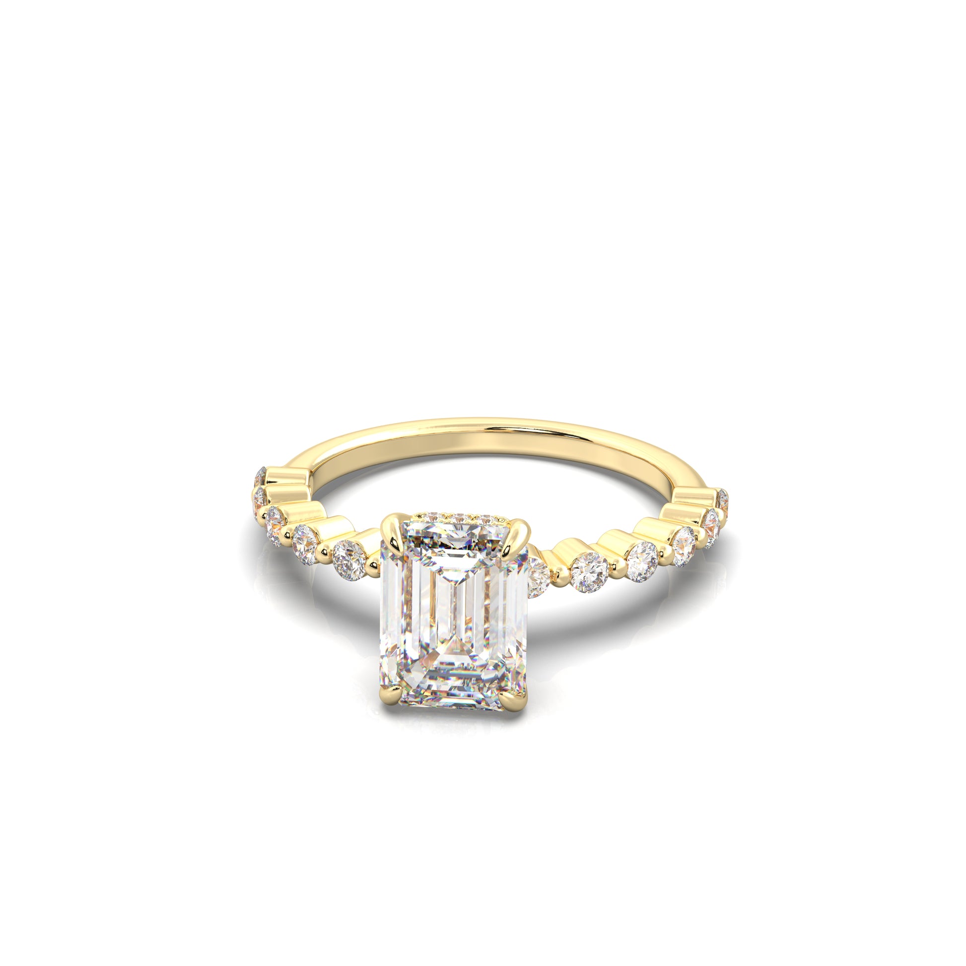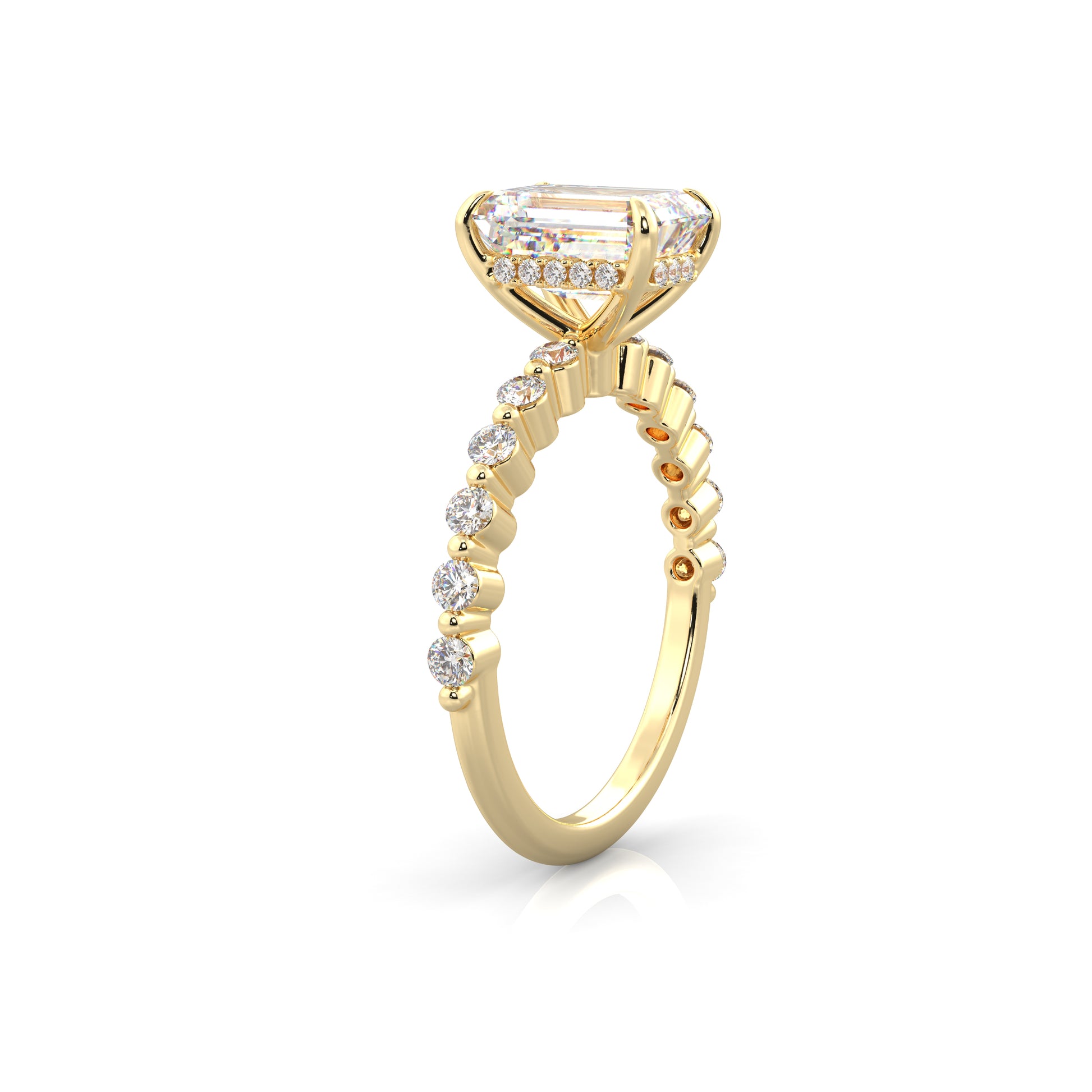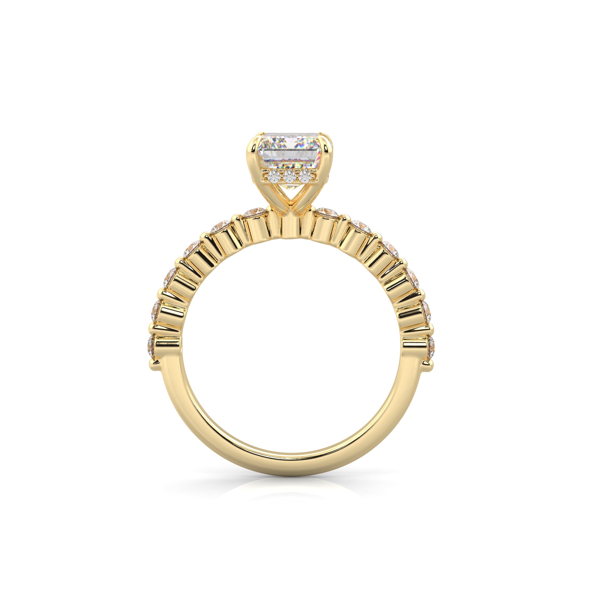 The Aleena is designed to turn heads. With round-cut diamonds lining the band in a shared prong setting, it delivers nonstop sparkle. A hidden halo adds extra shine beneath the center stone, making it stand out even more. Elevated and eye-catching, the center diamond takes center stage. This ring is all about timeless beauty and bold brilliance.