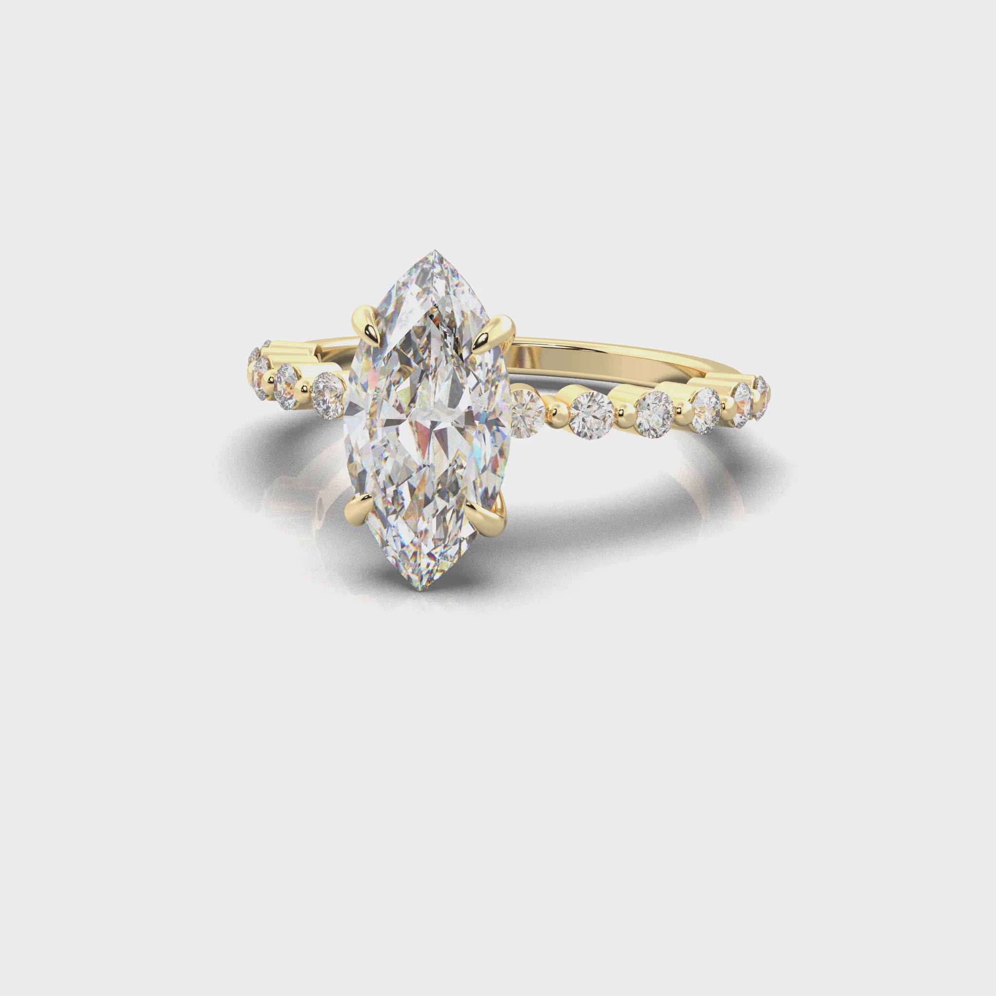 The Aleena is designed to turn heads. With round-cut diamonds lining the band in a shared prong setting, it delivers nonstop sparkle. A hidden halo adds extra shine beneath the center stone, making it stand out even more. Elevated and eye-catching, the center diamond takes center stage. This ring is all about timeless beauty and bold brilliance.