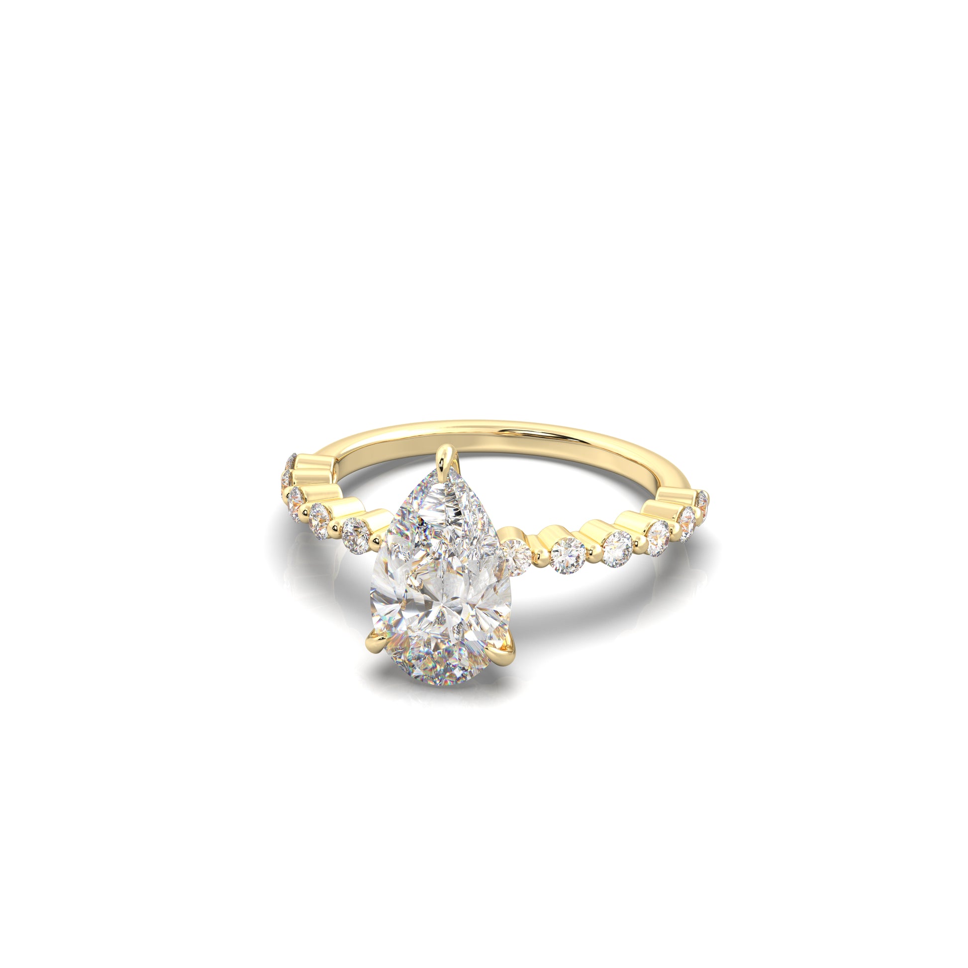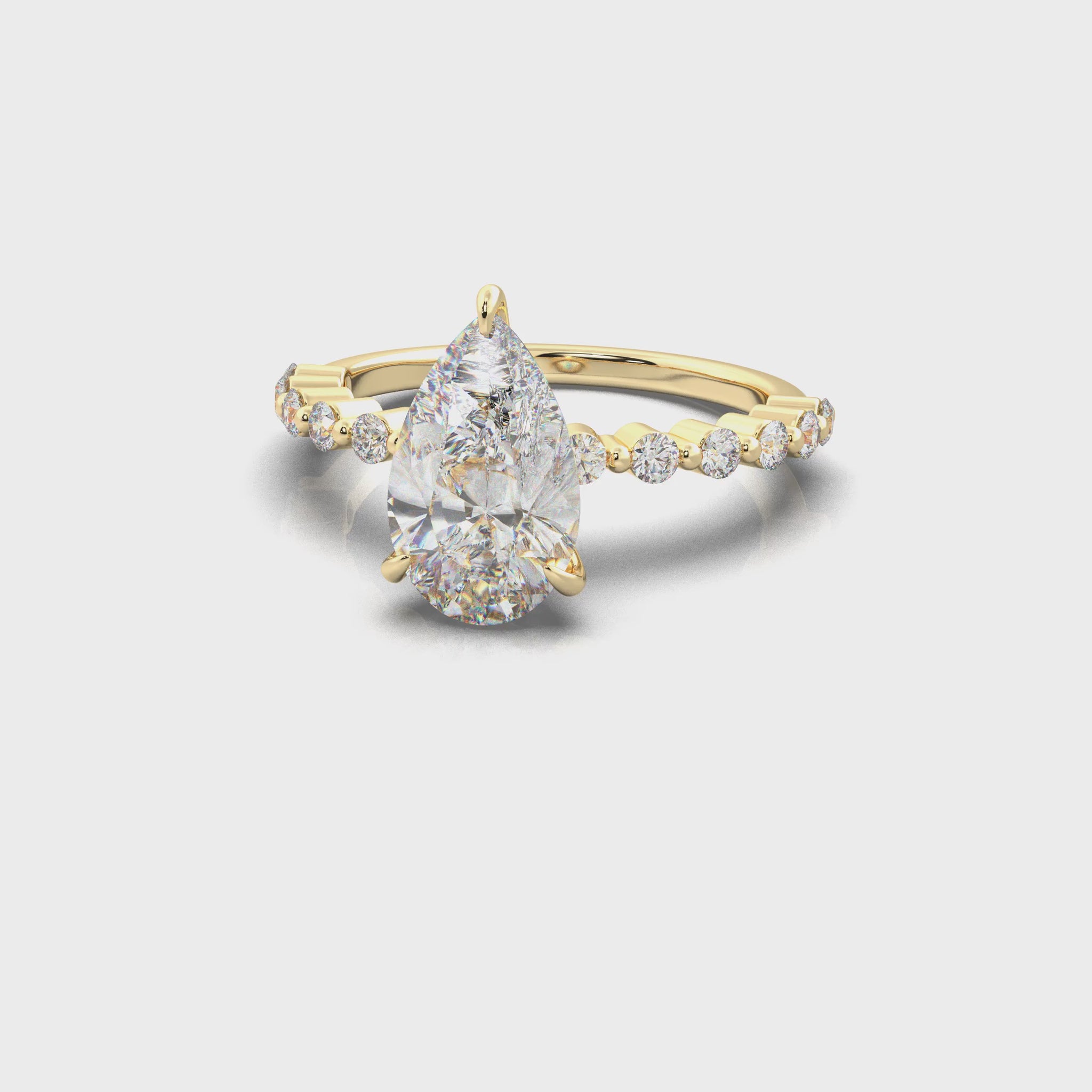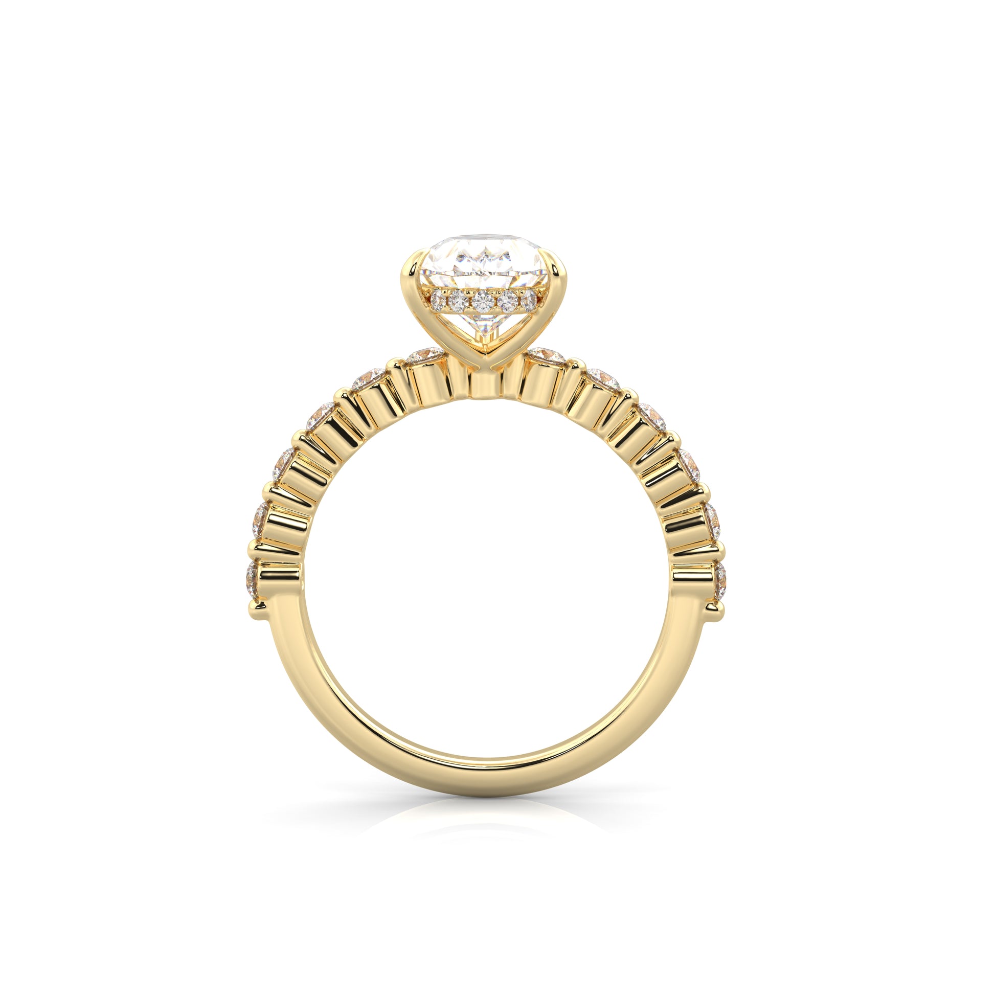 The Aleena is designed to turn heads. With round-cut diamonds lining the band in a shared prong setting, it delivers nonstop sparkle. A hidden halo adds extra shine beneath the center stone, making it stand out even more. Elevated and eye-catching, the center diamond takes center stage. This ring is all about timeless beauty and bold brilliance.