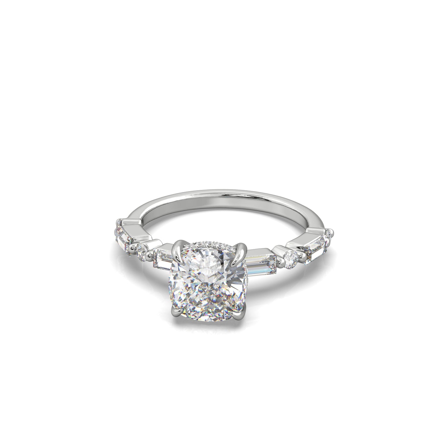 The Celine is all about bold sparkle with a refined twist. A hidden halo wraps around the center stone to boost its brilliance, while alternating baguette and round-cut diamonds line half the band in shared prongs. The mix of shapes gives The Celine a unique, eye-catching look that’s both modern and elegant.