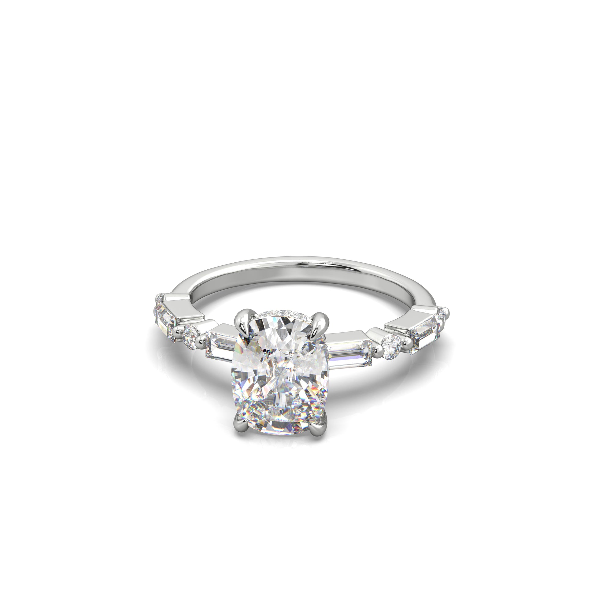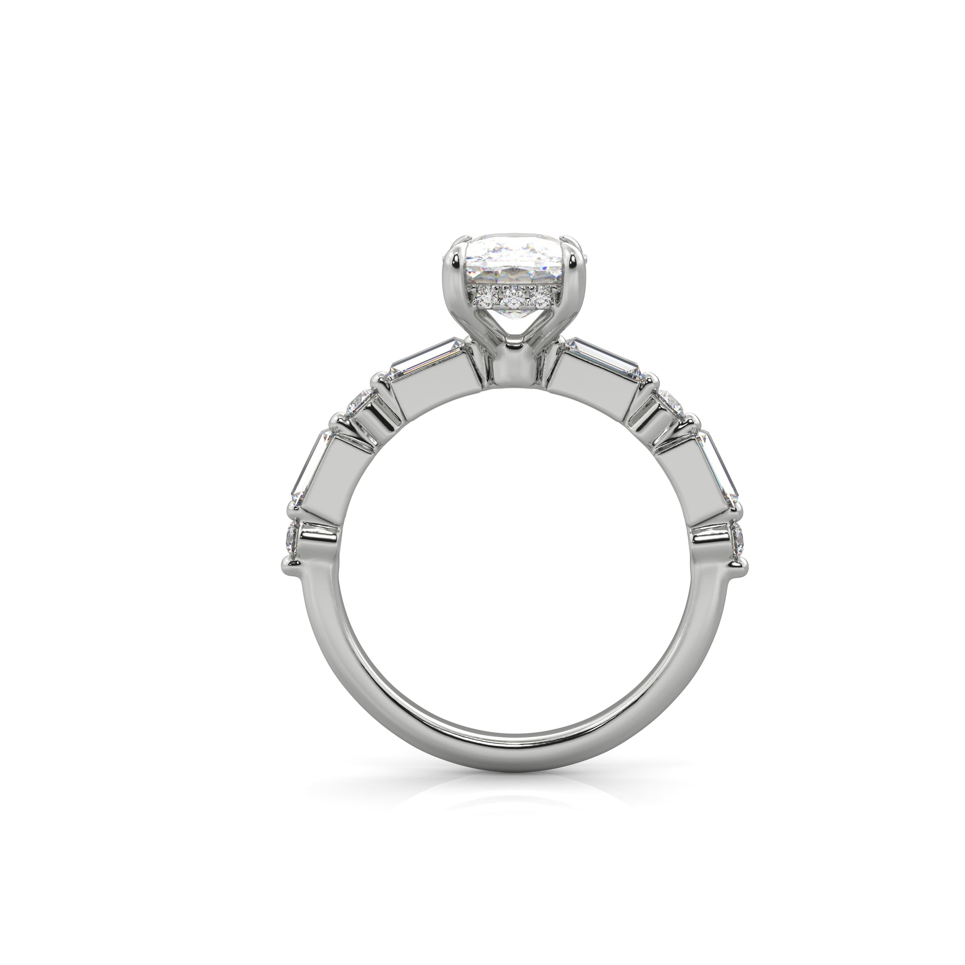 The Celine is all about bold sparkle with a refined twist. A hidden halo wraps around the center stone to boost its brilliance, while alternating baguette and round-cut diamonds line half the band in shared prongs. The mix of shapes gives The Celine a unique, eye-catching look that’s both modern and elegant.