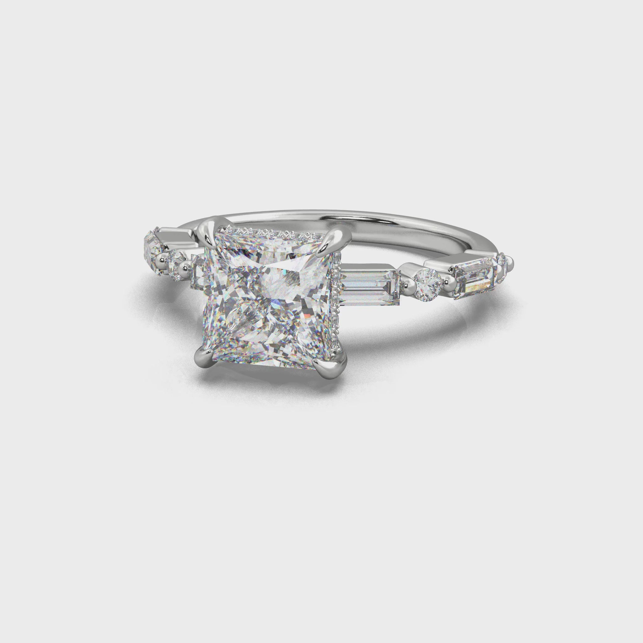 The Celine is all about bold sparkle with a refined twist. A hidden halo wraps around the center stone to boost its brilliance, while alternating baguette and round-cut diamonds line half the band in shared prongs. The mix of shapes gives The Celine a unique, eye-catching look that’s both modern and elegant.
