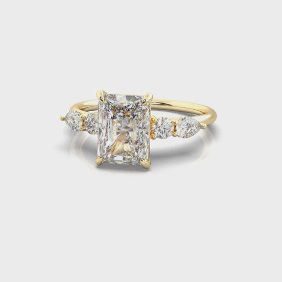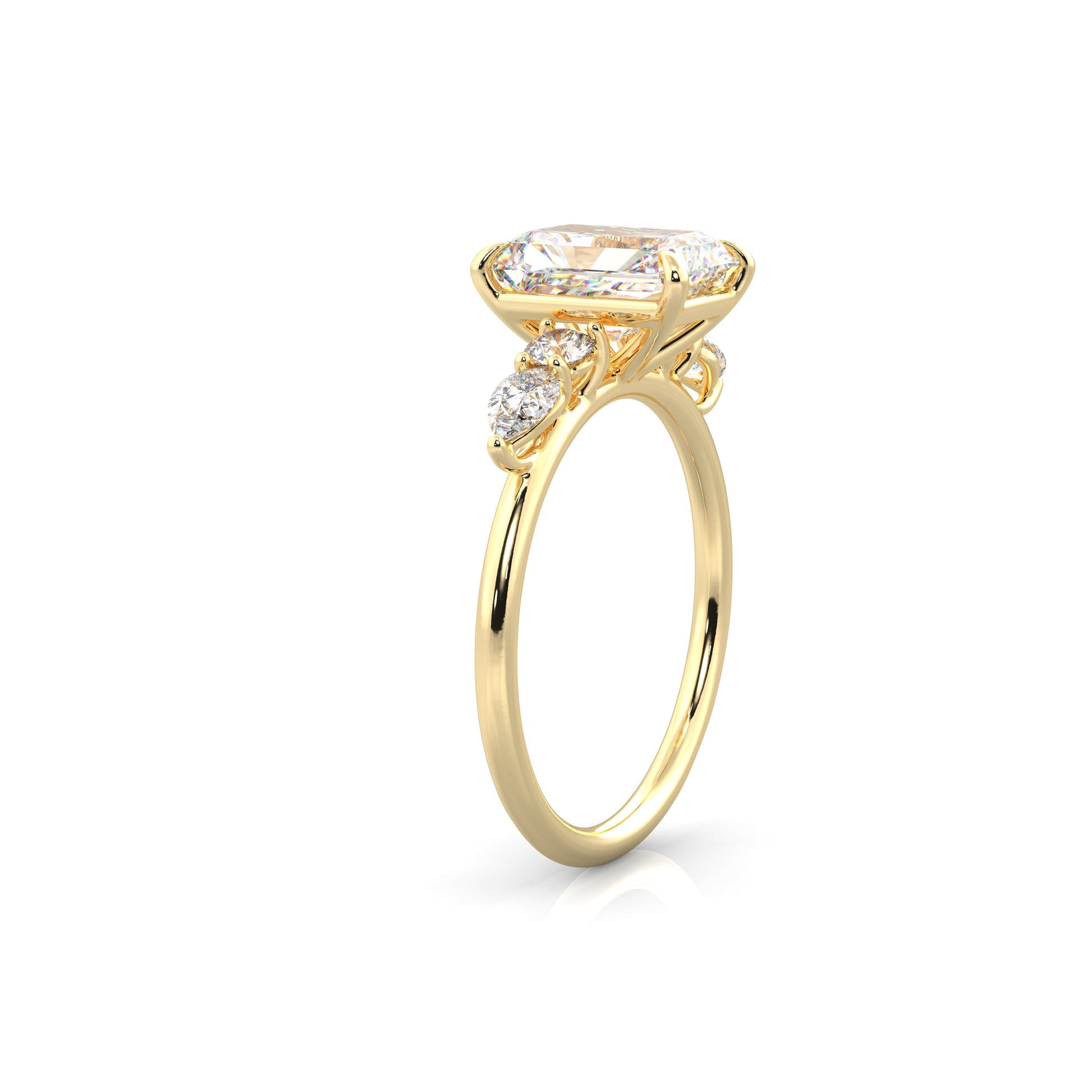 The Eliza is a timeless design with a graceful twist. On each side of the center stone, a round and pear-shaped diamond come together to create a balanced, elegant look with just the right amount of sparkle. This unique combination adds a soft, romantic touch while drawing attention to the center. Classic, refined, and effortlessly stunning—The Eliza makes a beautiful statement of love.