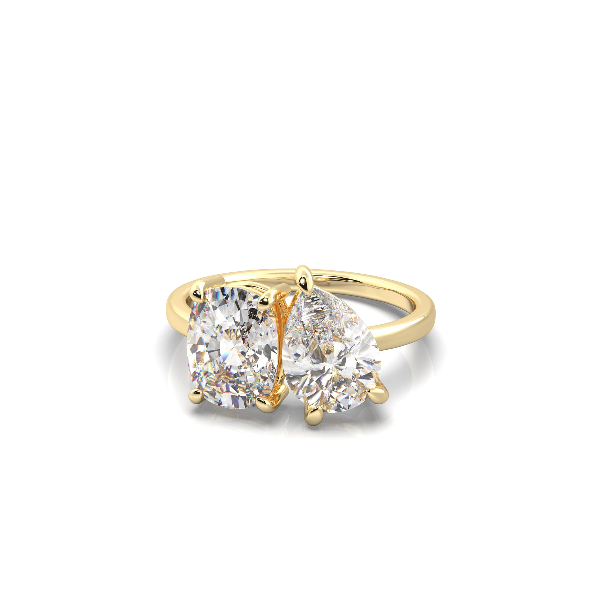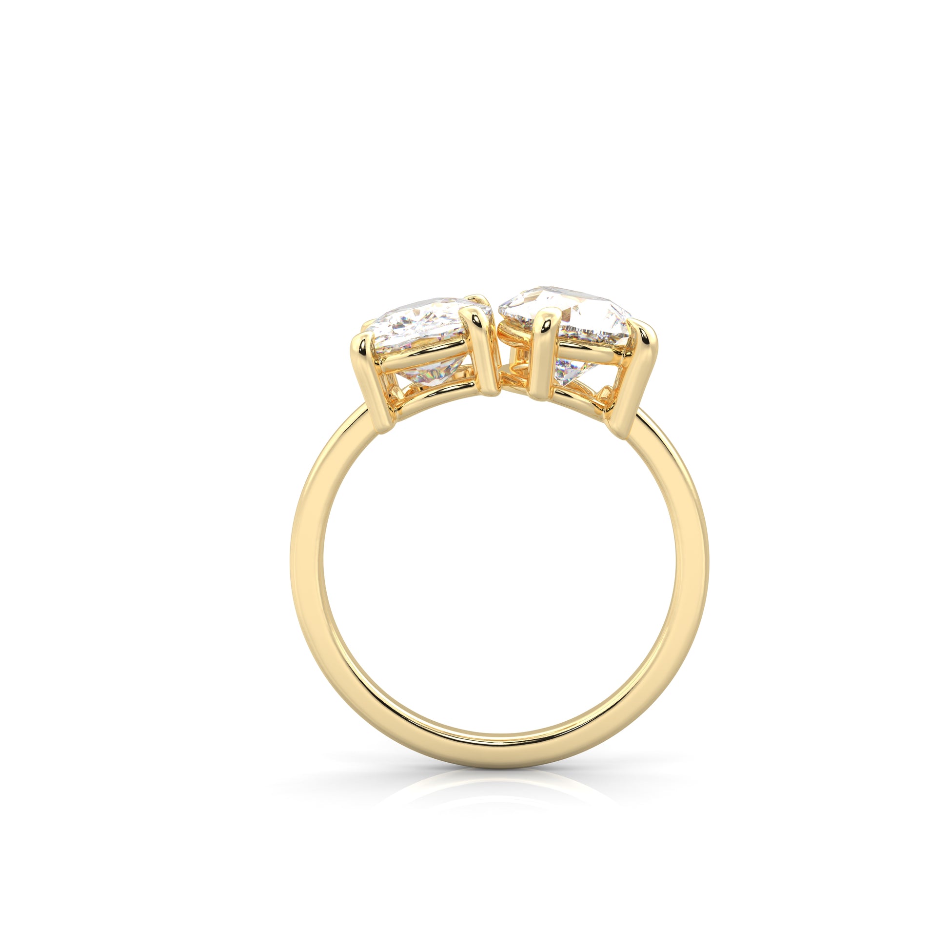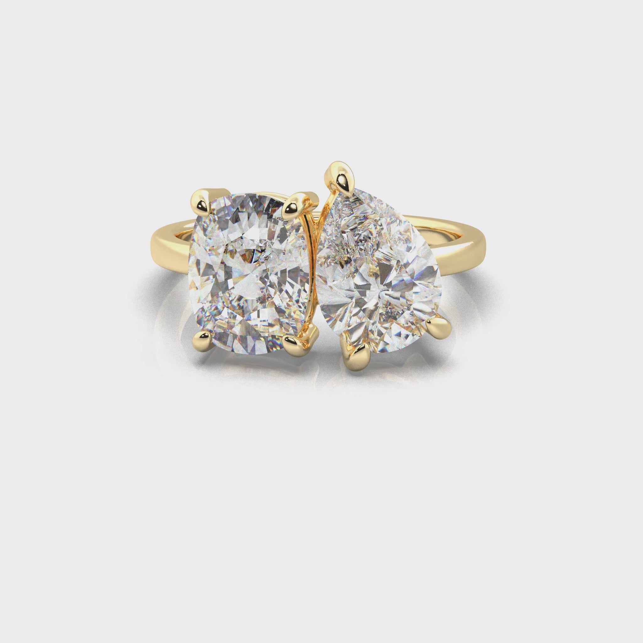 The Karma is a modern take on the classic Toi et Moi style—French for “you and me.” This romantic two-stone design symbolizes the union of two souls, side by side. Featuring a mix of bold diamond shapes like round, oval, pear, or emerald cuts, each stone complements the other in perfect harmony. Set in a sleek prong setting that maximizes light and brilliance, The Karma is a meaningful piece that beautifully captures balance, connection, and love.