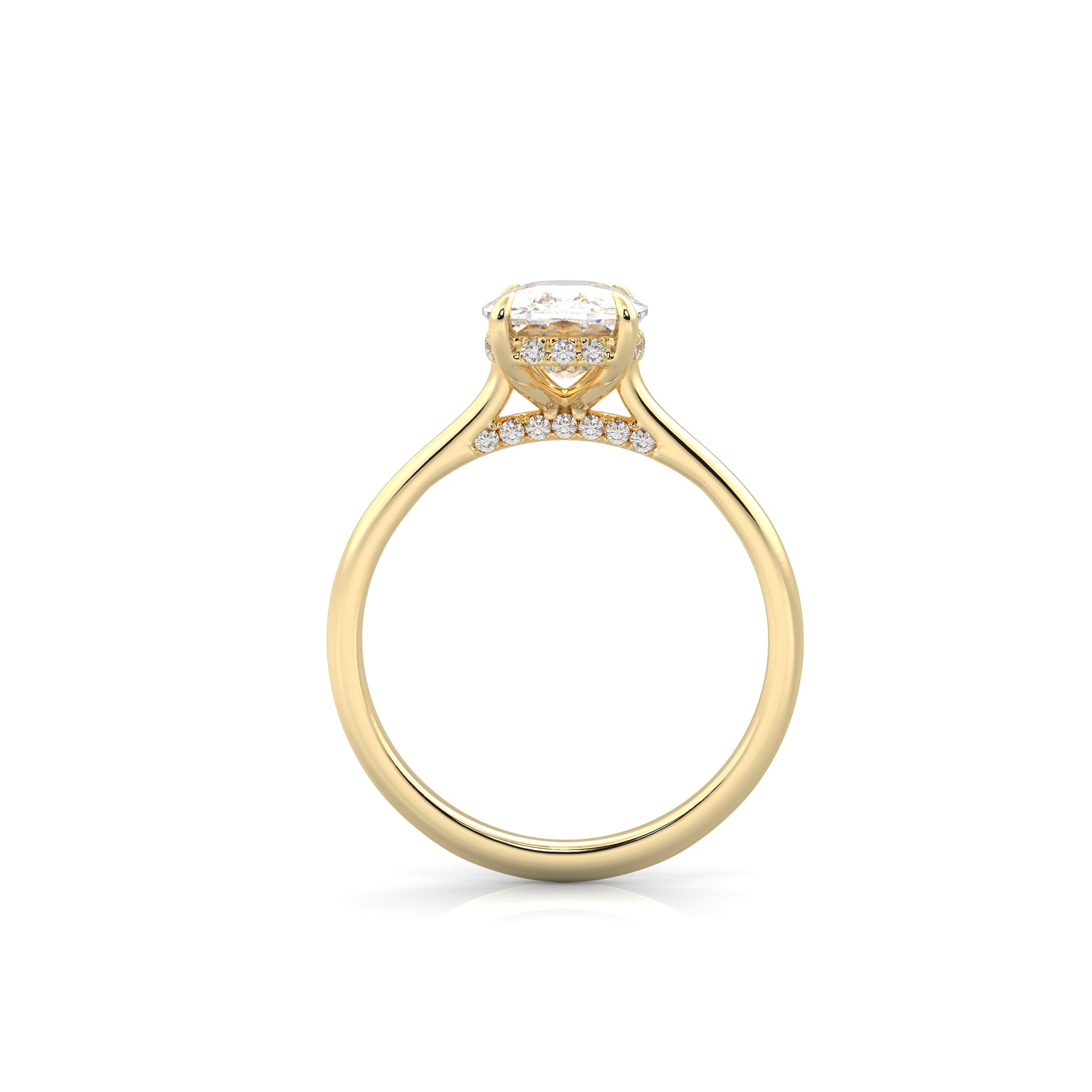 The Meena is a timeless cathedral solitaire with elegant details. Twin pavé rows and a polished band create a graceful silhouette, while a hidden halo adds a subtle sparkle beneath the claw-set center stone. Classic, versatile, and effortlessly stunning.