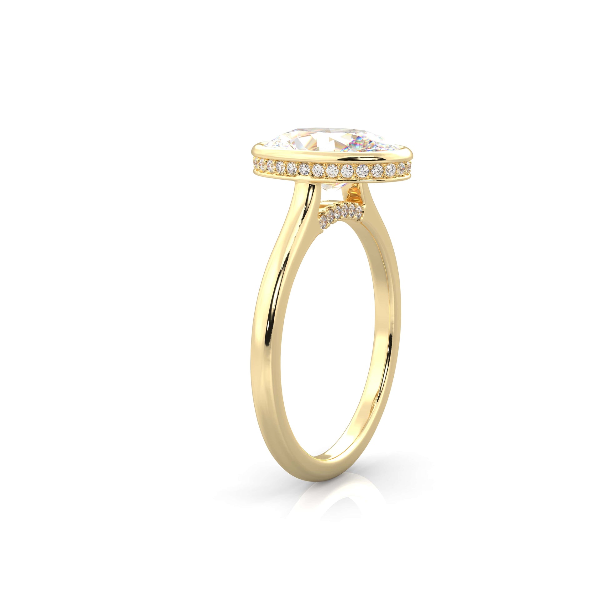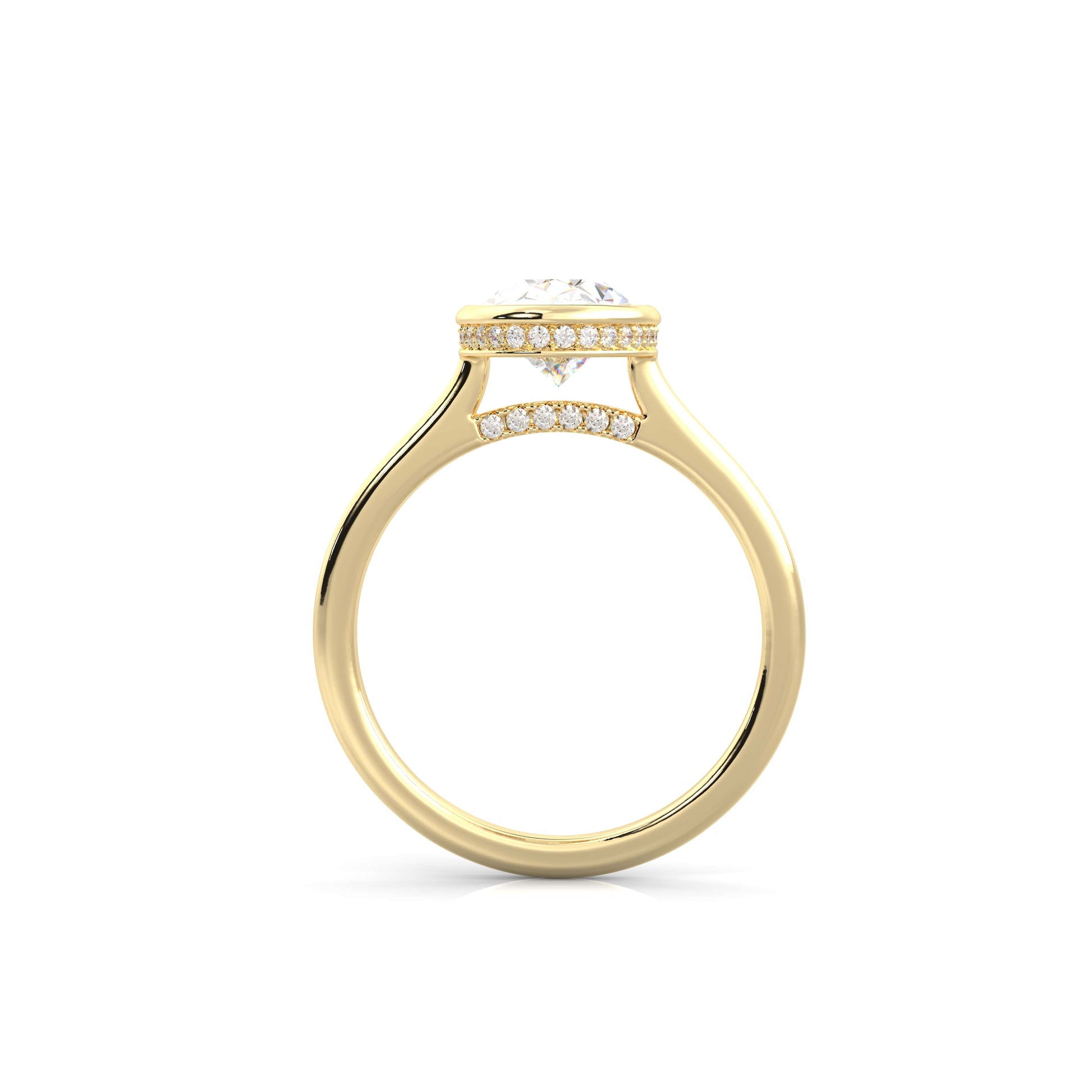 Refined, modern, and effortlessly elegant. The Noelle features a bezel set center diamond framed in a graceful cathedral setting, accented with a hidden halo and pavé diamonds along the cathedral for added brilliance. Sleek yet timeless, this design blends clean lines with delicate sparkle, making it a sophisticated symbol of love.