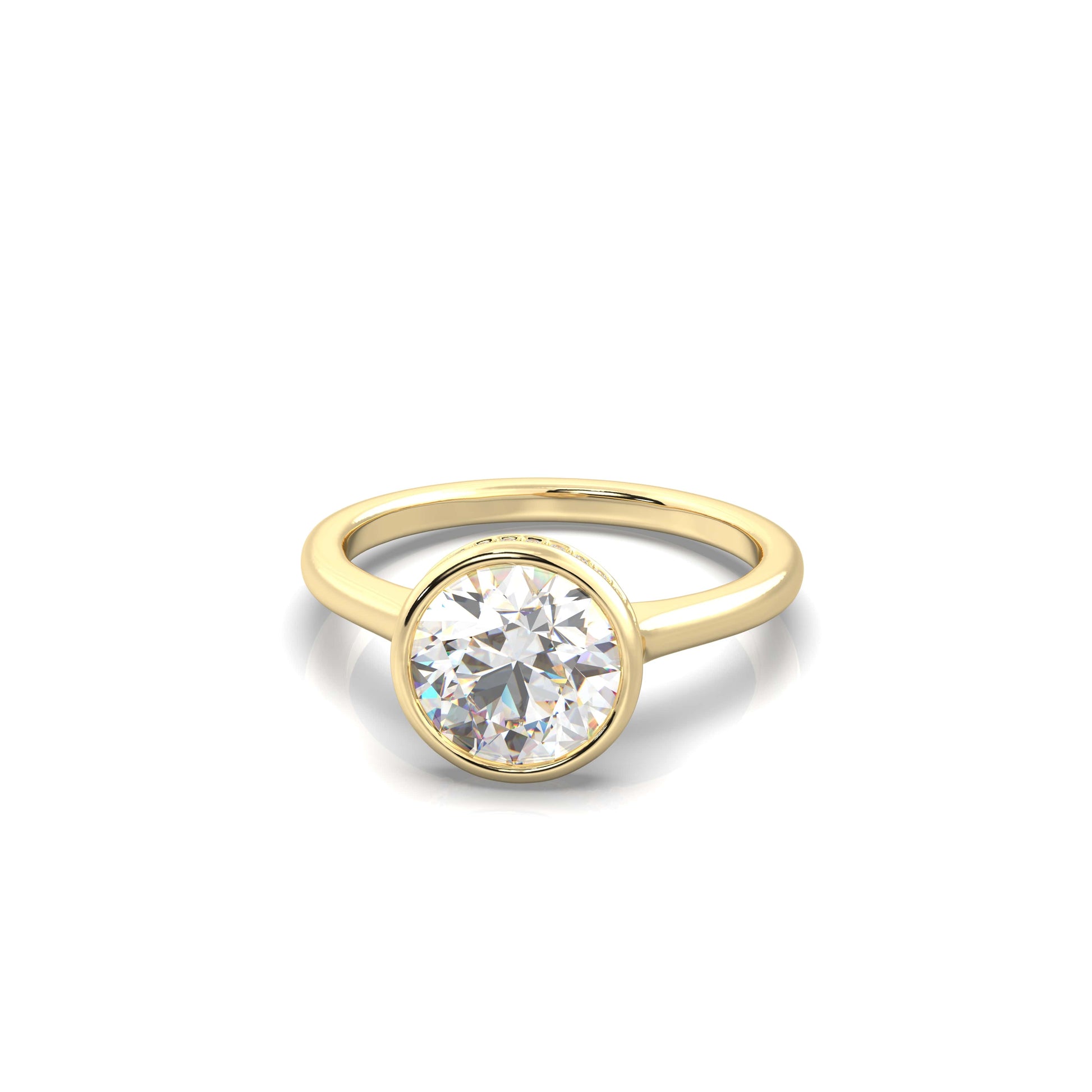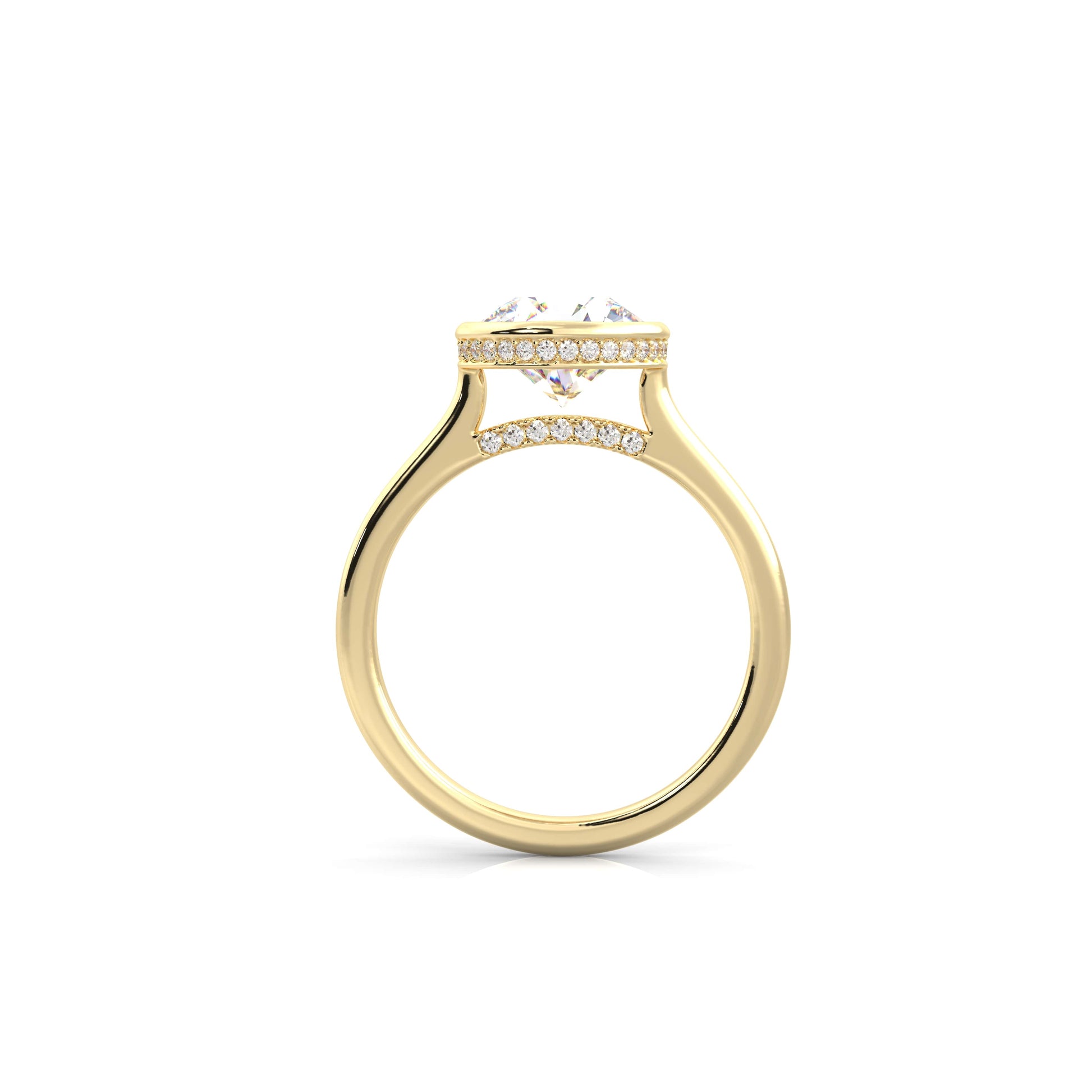 Refined, modern, and effortlessly elegant. The Noelle features a bezel set center diamond framed in a graceful cathedral setting, accented with a hidden halo and pavé diamonds along the cathedral for added brilliance. Sleek yet timeless, this design blends clean lines with delicate sparkle, making it a sophisticated symbol of love.