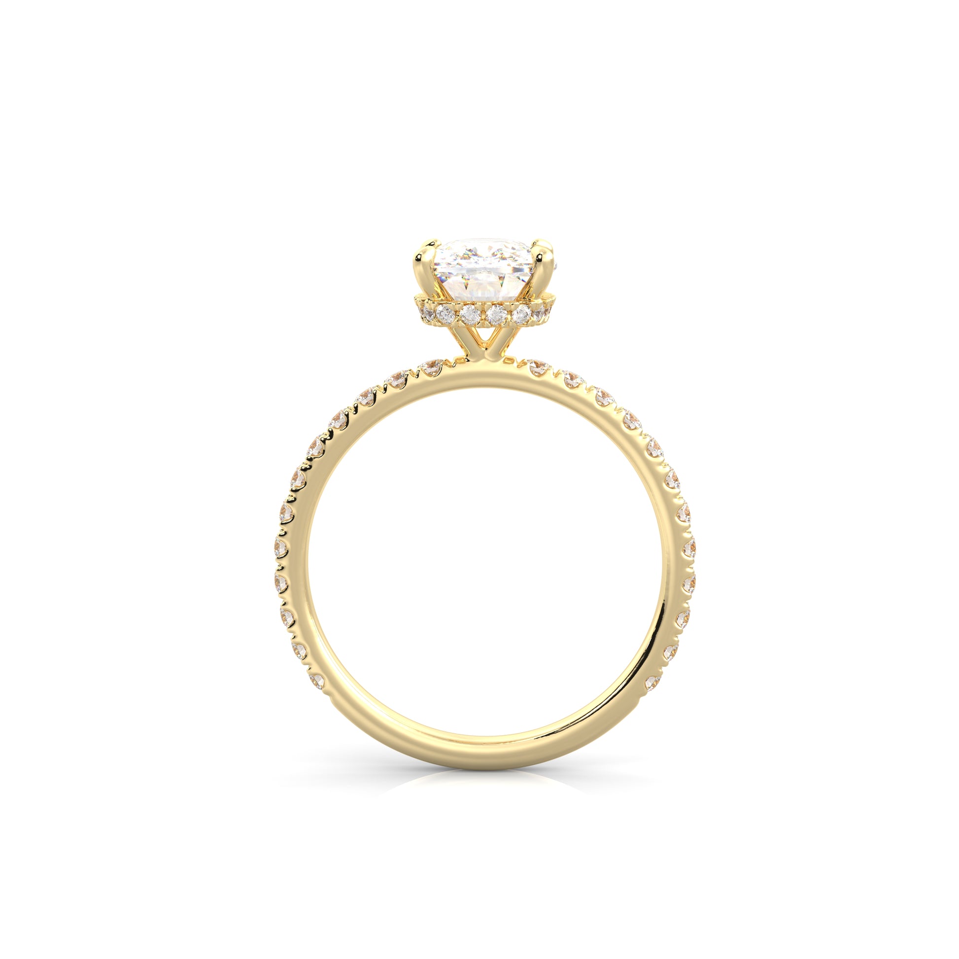 The Noor features a pavé diamond band paired with a wraparound halo that embraces the center stone in brilliance. A modern silhouette with timeless sparkle—refined, radiant, and unforgettable.