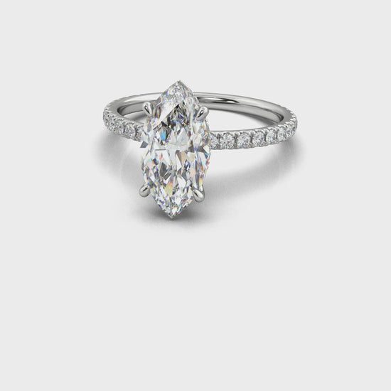 The Noor features a pavé diamond band paired with a wraparound halo that embraces the center stone in brilliance. A modern silhouette with timeless sparkle—refined, radiant, and unforgettable.