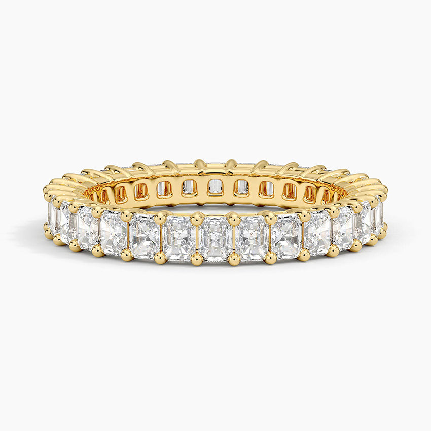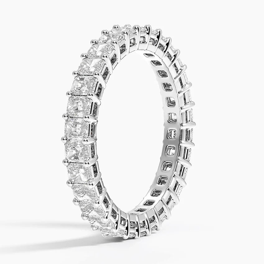 Bold brilliance, redefined. Our Radiant Cut Diamond Eternity Band features a seamless row of radiant-cut lab-grown diamonds, combining the angular elegance of emerald cuts with the fiery sparkle of round brilliants. A striking choice for the modern bride.