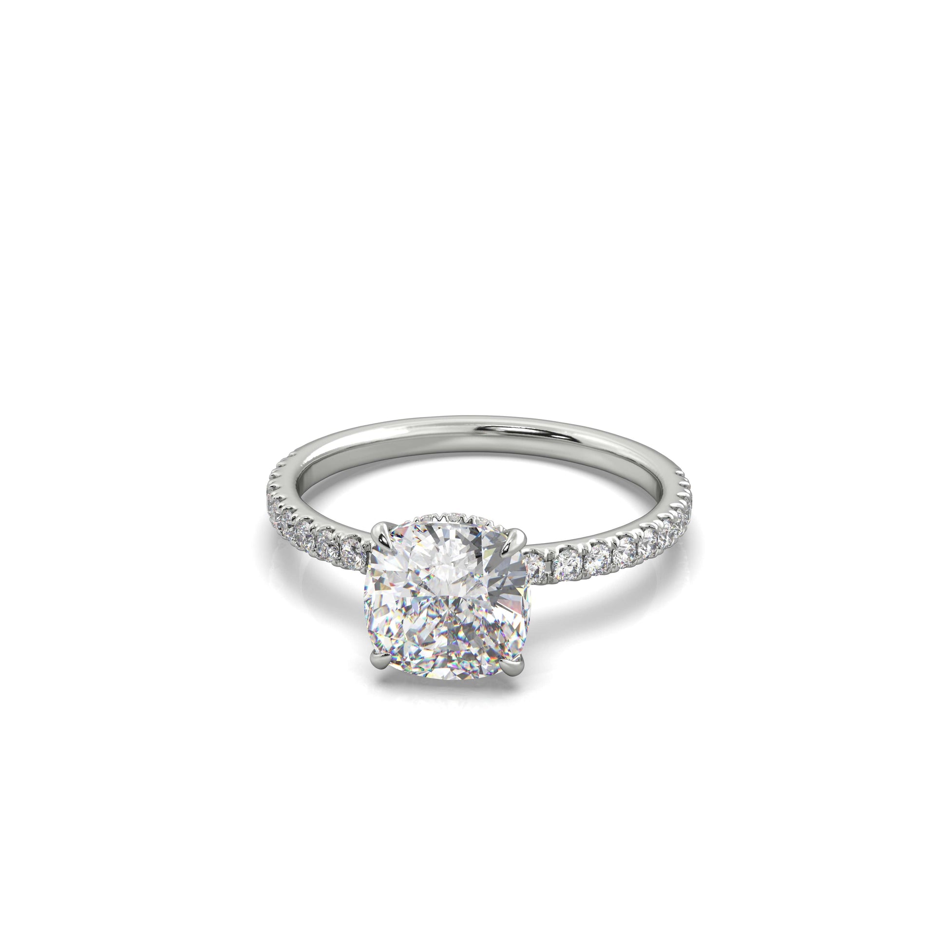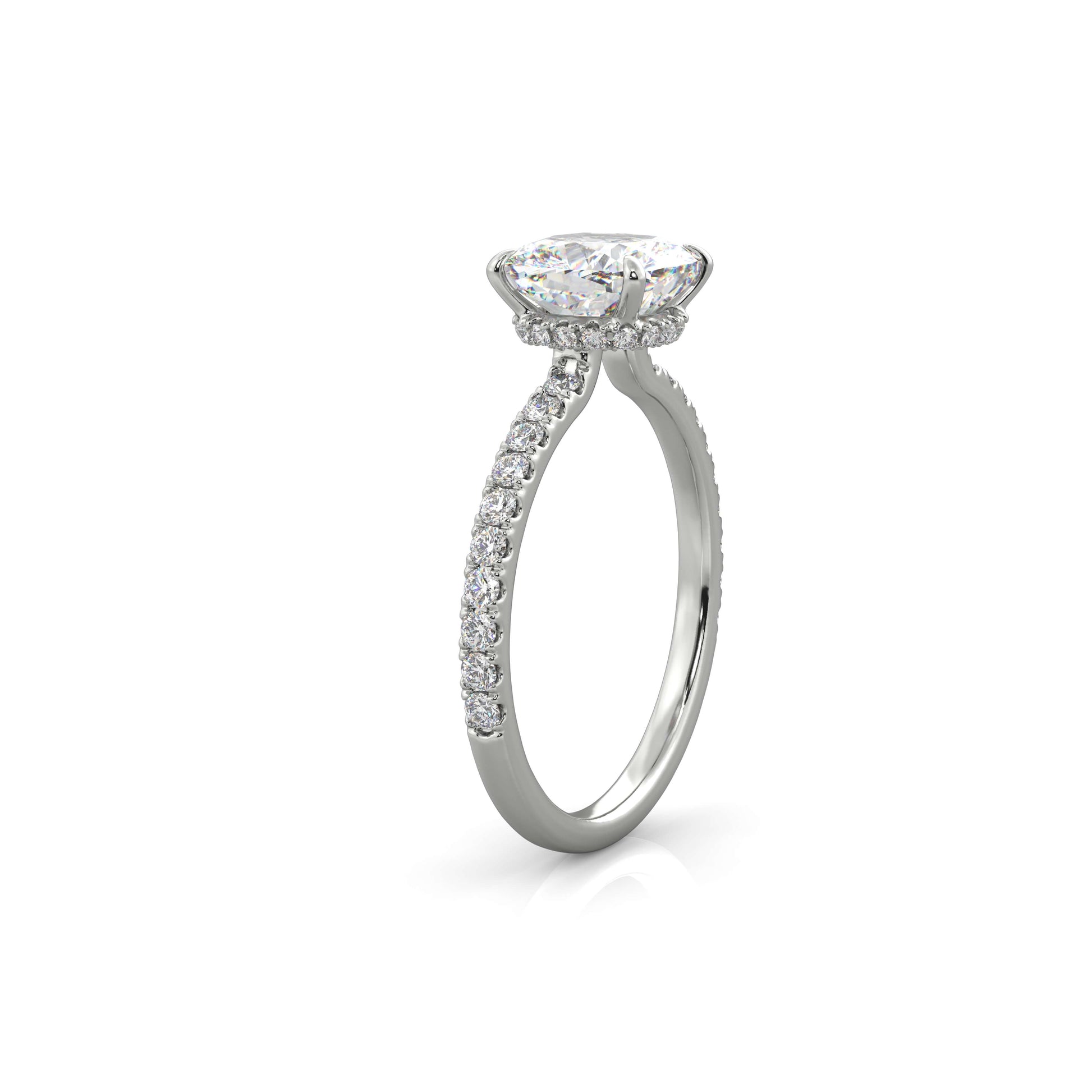 Delicate, modern, and effortlessly timeless. The Sofi features a pavé diamond band paired with a low set hidden halo, offering understated brilliance while keeping the center stone close to the finger. This design blends comfort, elegance, and a subtle sparkle that enhances the beauty of the center diamond without distraction.