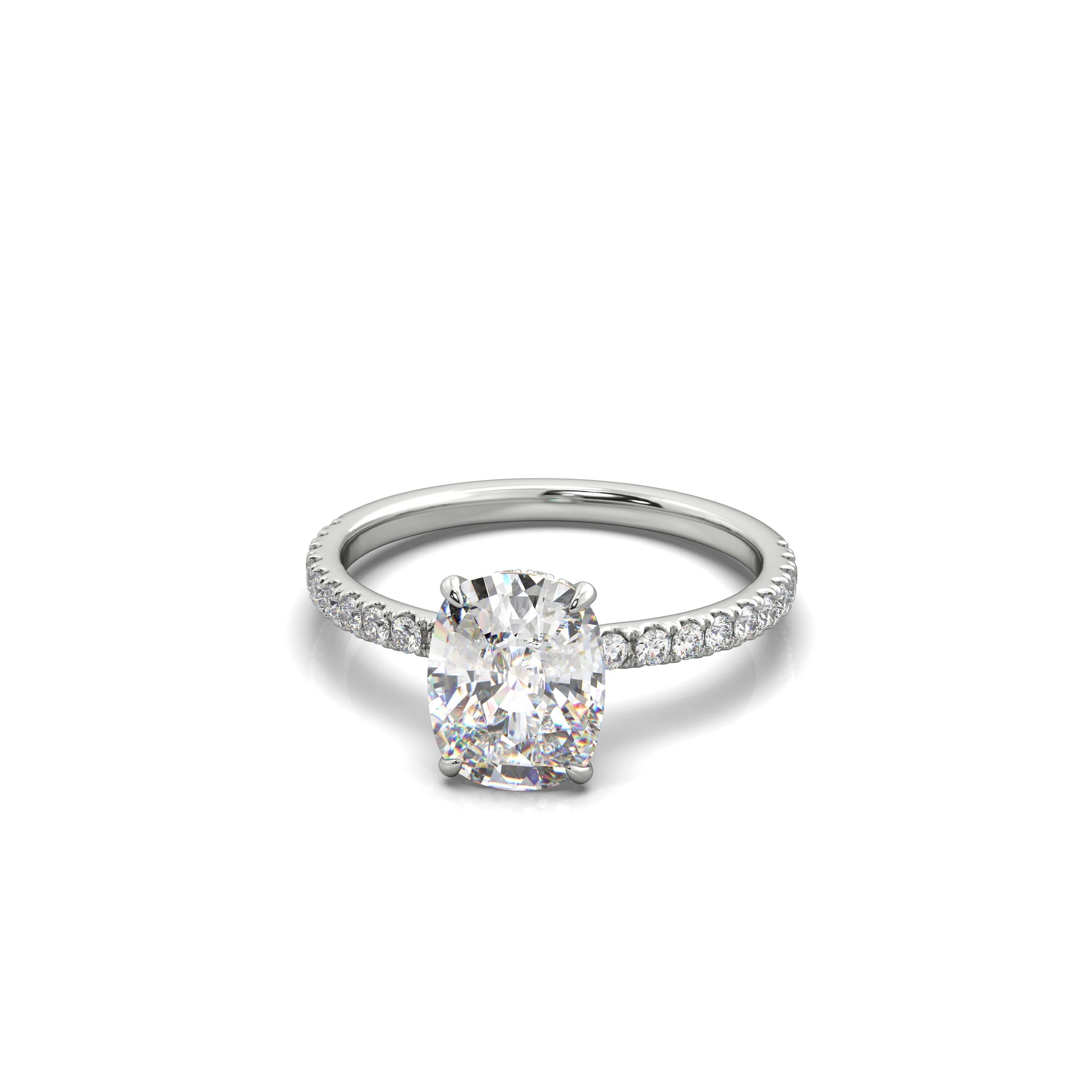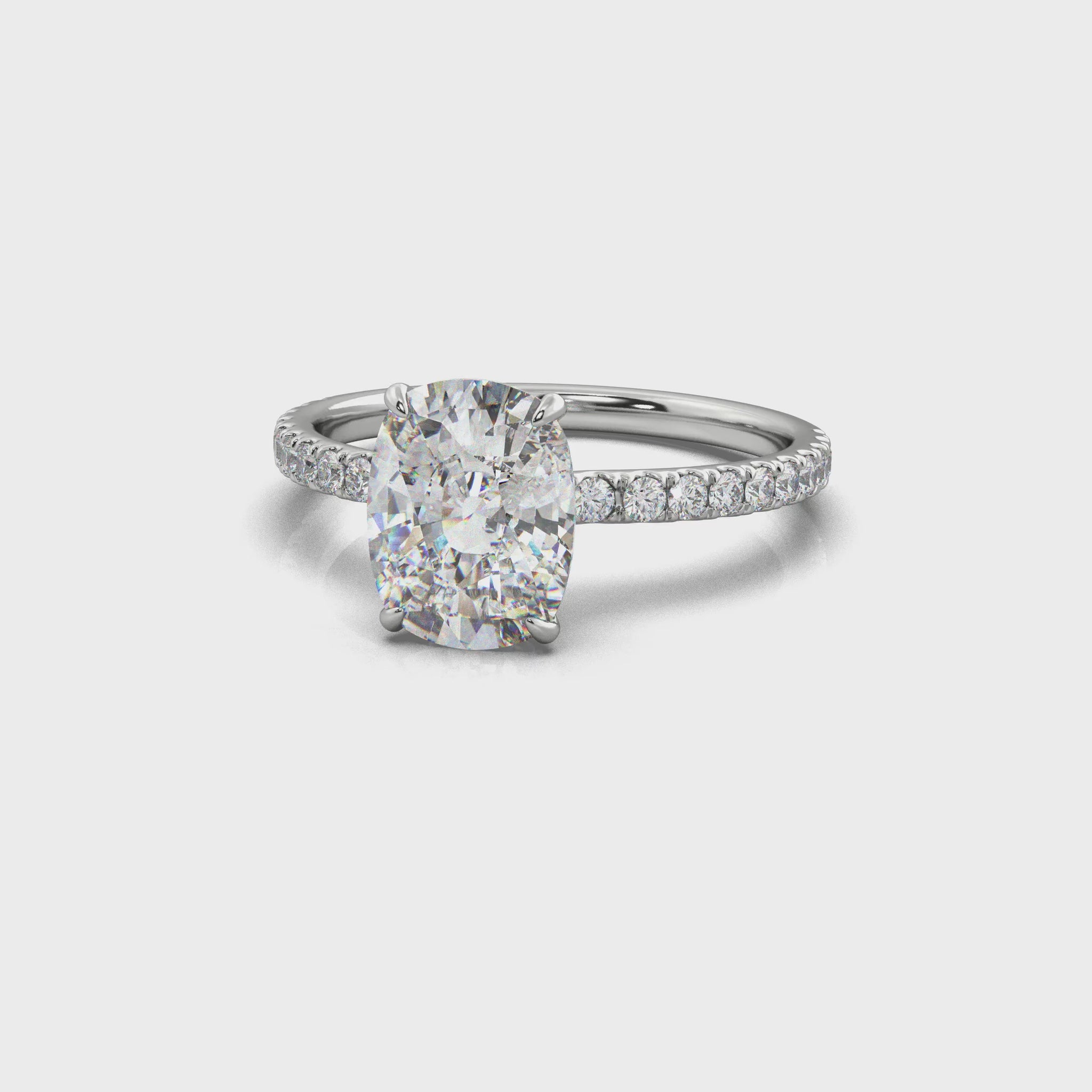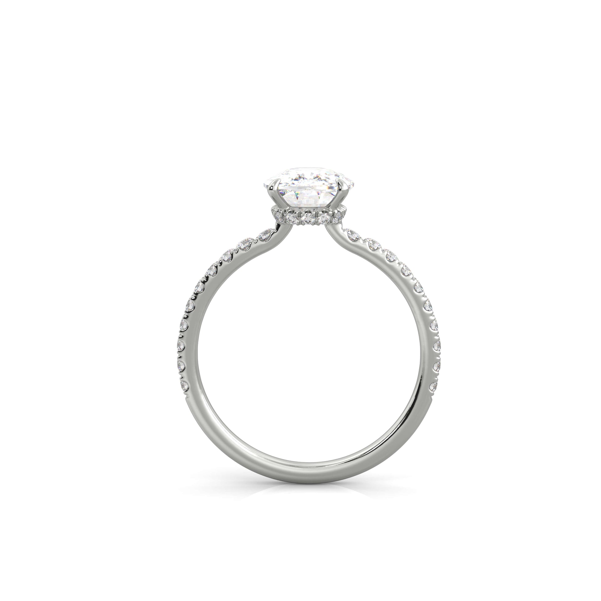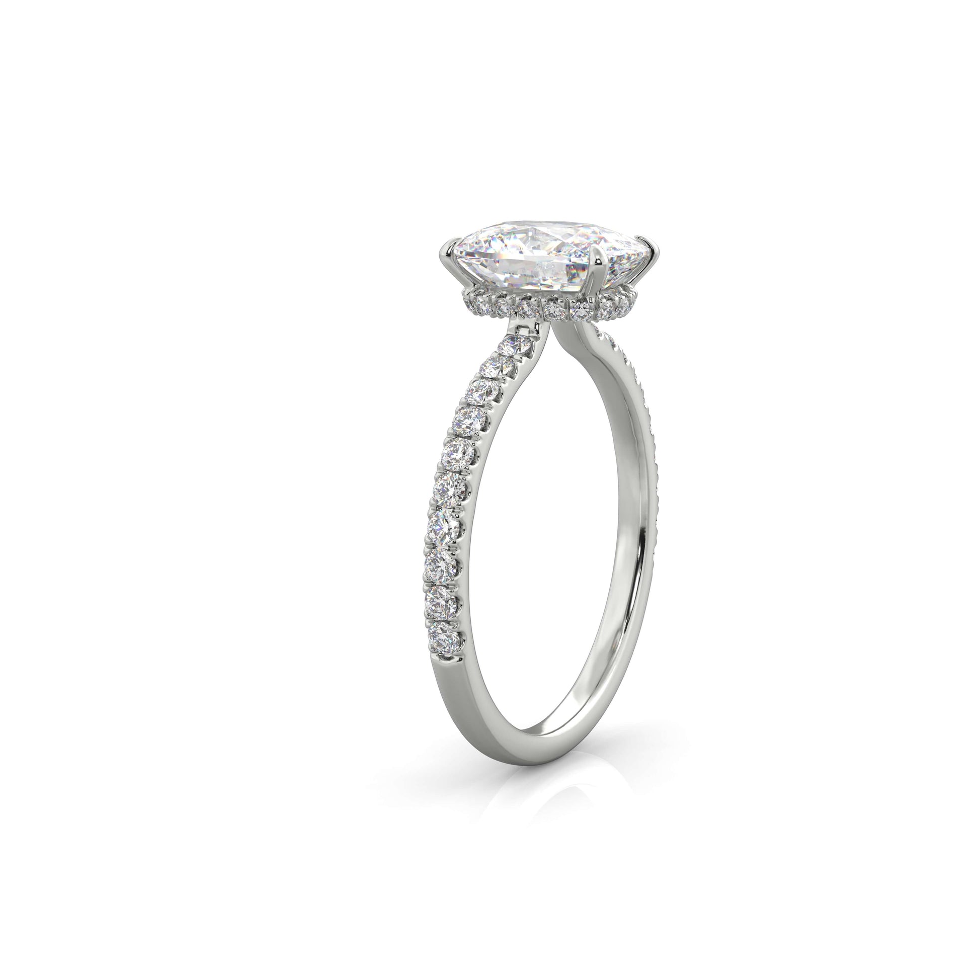 Delicate, modern, and effortlessly timeless. The Sofi features a pavé diamond band paired with a low set hidden halo, offering understated brilliance while keeping the center stone close to the finger. This design blends comfort, elegance, and a subtle sparkle that enhances the beauty of the center diamond without distraction.