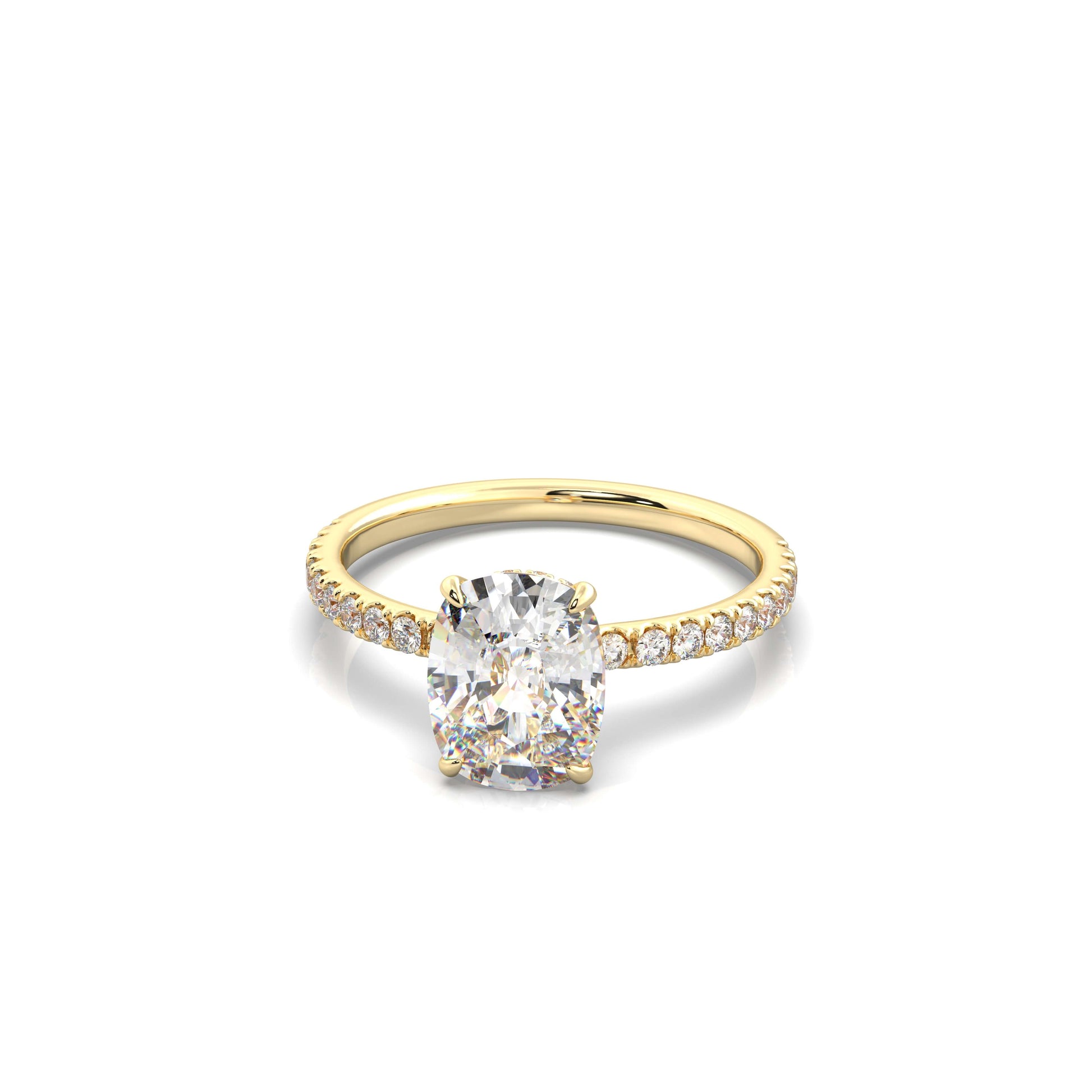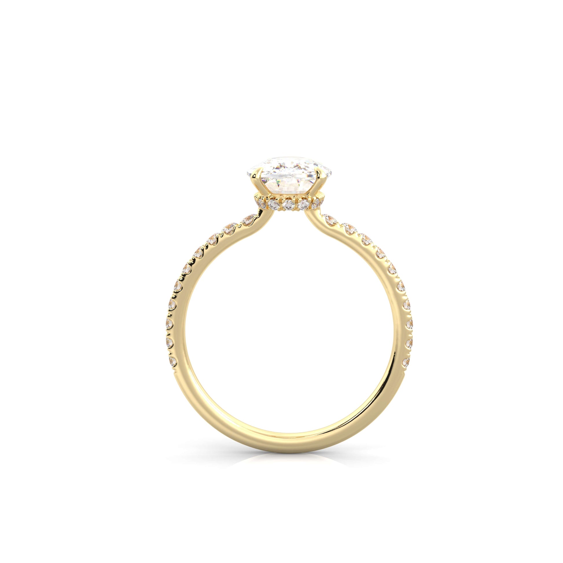 Delicate, modern, and effortlessly timeless. The Sofi features a pavé diamond band paired with a low set hidden halo, offering understated brilliance while keeping the center stone close to the finger. This design blends comfort, elegance, and a subtle sparkle that enhances the beauty of the center diamond without distraction.