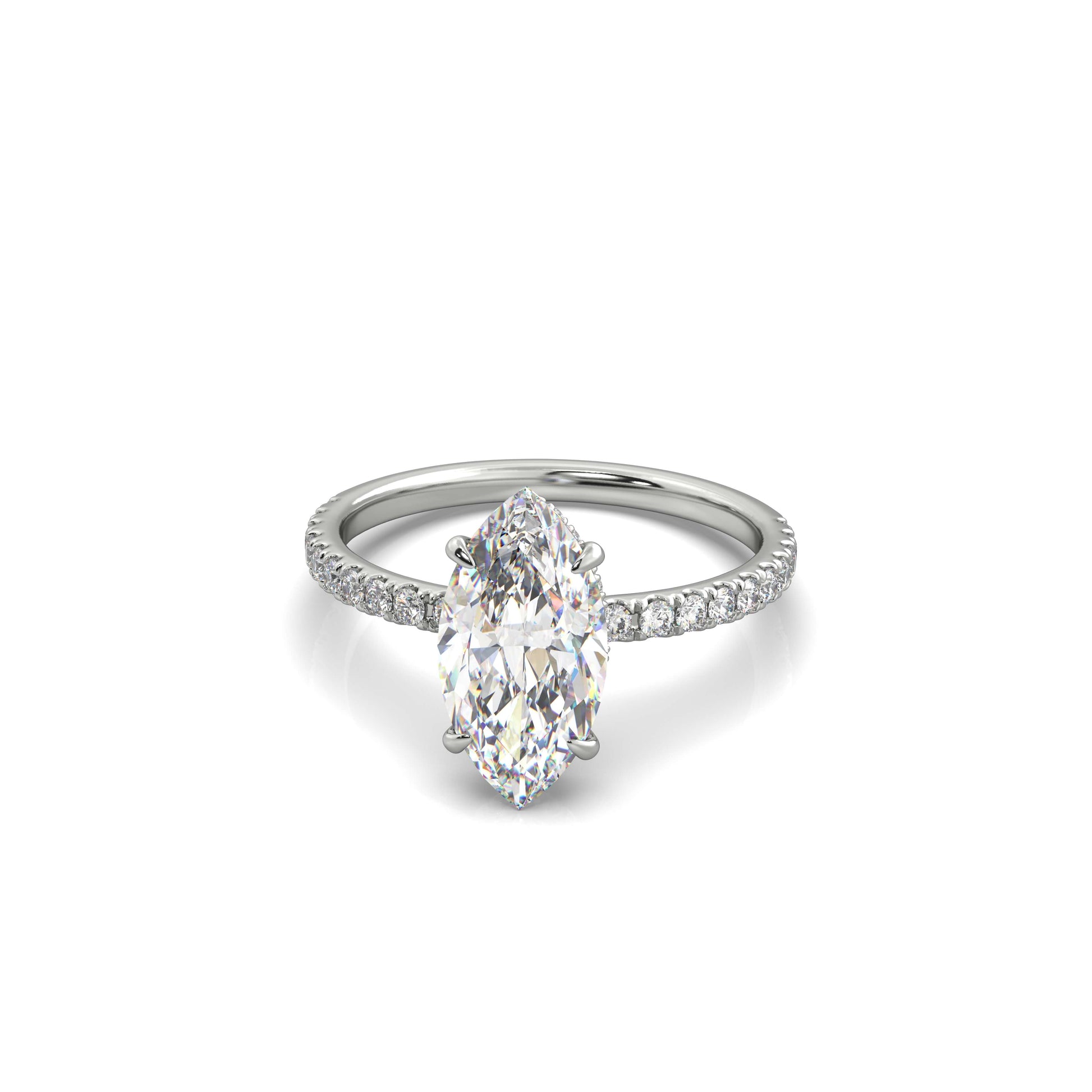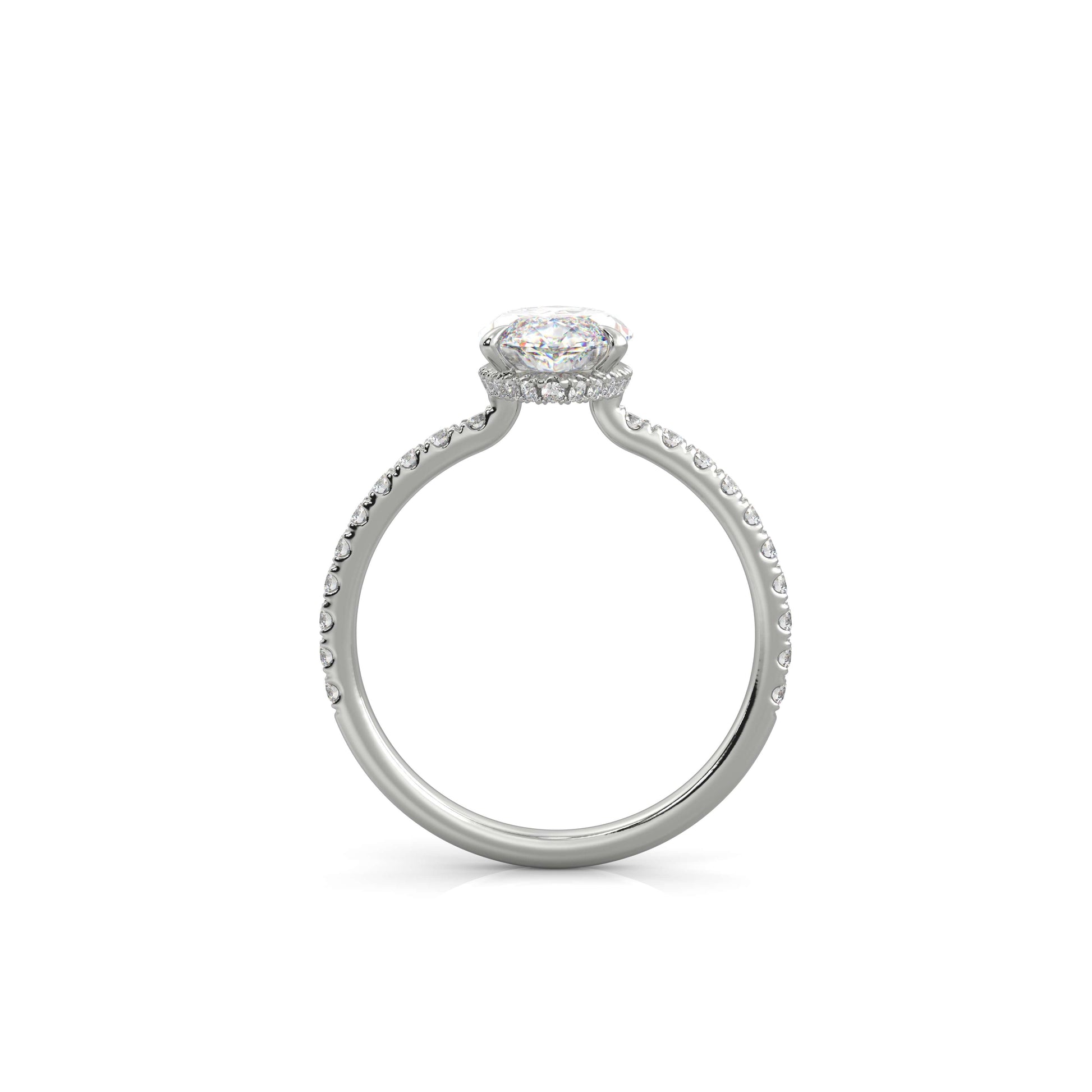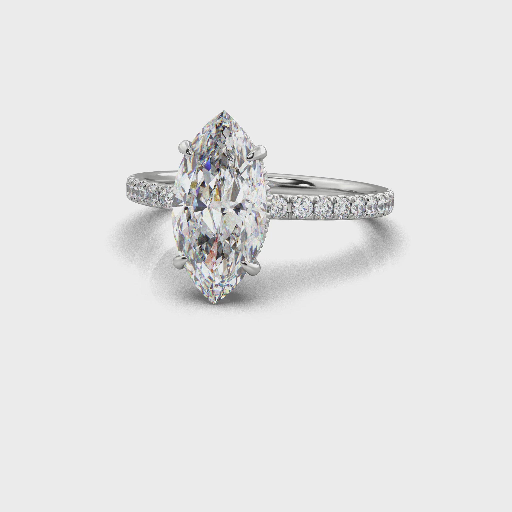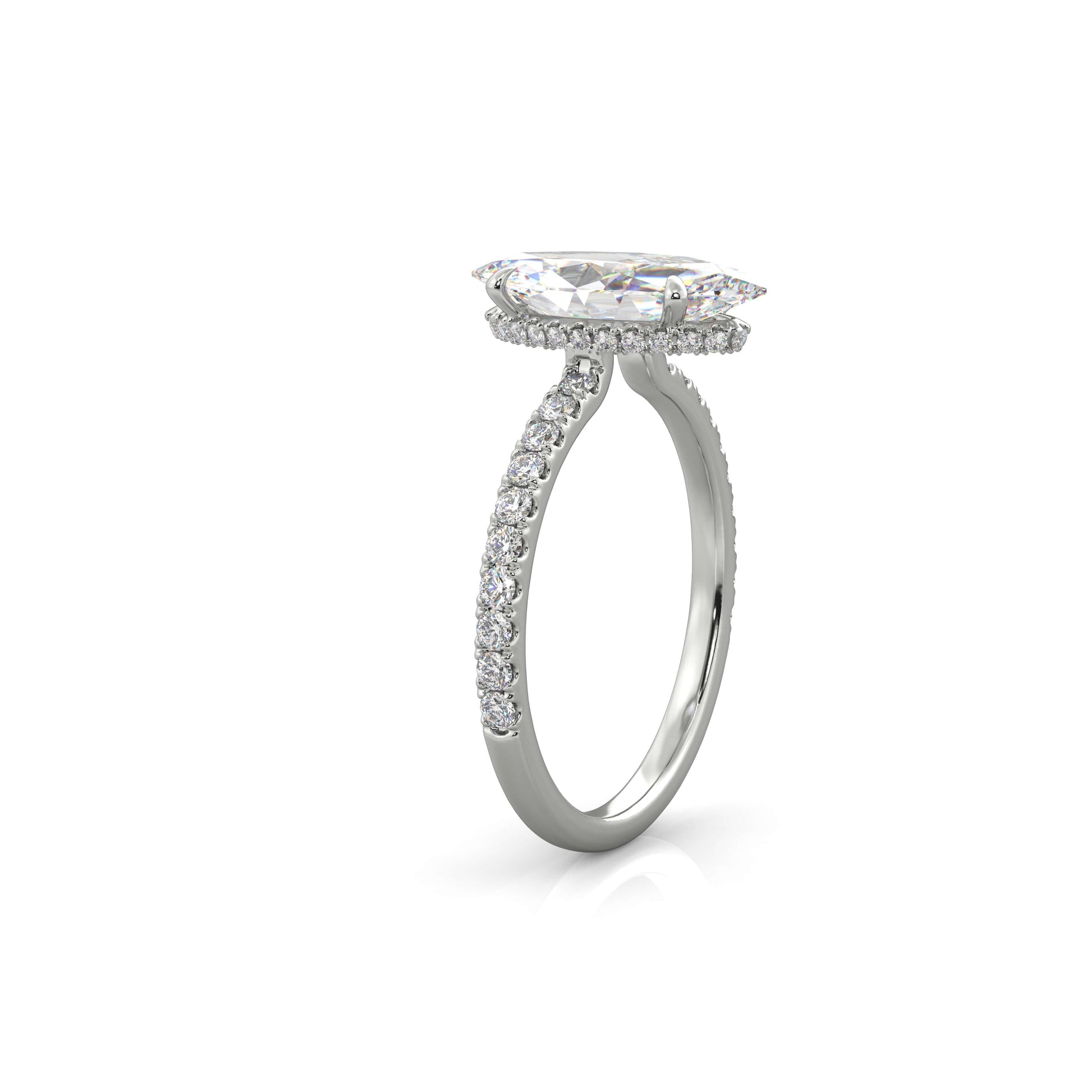 Delicate, modern, and effortlessly timeless. The Sofi features a pavé diamond band paired with a low set hidden halo, offering understated brilliance while keeping the center stone close to the finger. This design blends comfort, elegance, and a subtle sparkle that enhances the beauty of the center diamond without distraction.