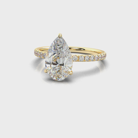 Delicate, modern, and effortlessly timeless. The Sofi features a pavé diamond band paired with a low set hidden halo, offering understated brilliance while keeping the center stone close to the finger. This design blends comfort, elegance, and a subtle sparkle that enhances the beauty of the center diamond without distraction.