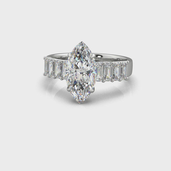The Zara is a bold design with refined sparkle. Emerald-cut side stones line the band for a sleek, structured look, while a hidden halo of round diamonds wraps beneath the center stone. Elevated and eye-catching, this ring brings timeless glamor with a modern edge.
