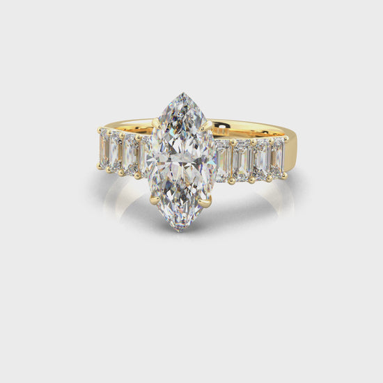 The Zara is a bold design with refined sparkle. Emerald-cut side stones line the band for a sleek, structured look, while a hidden halo of round diamonds wraps beneath the center stone. Elevated and eye-catching, this ring brings timeless glamor with a modern edge.